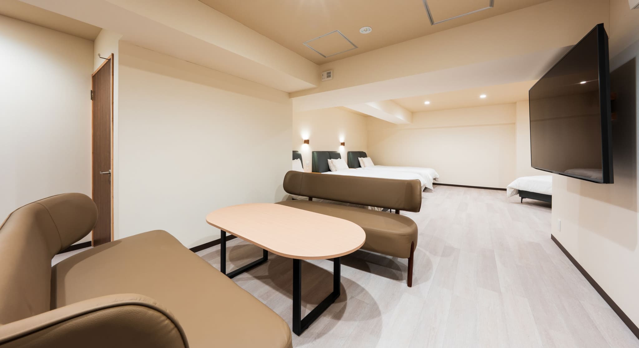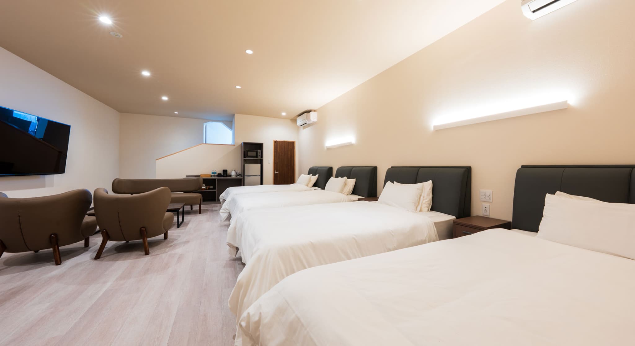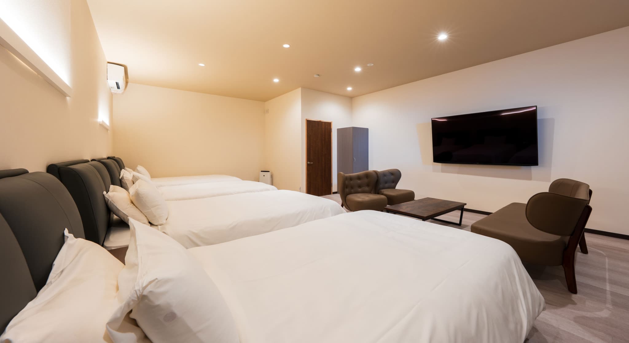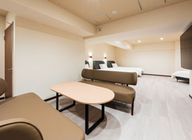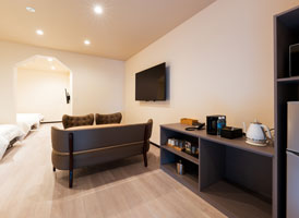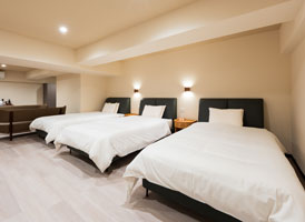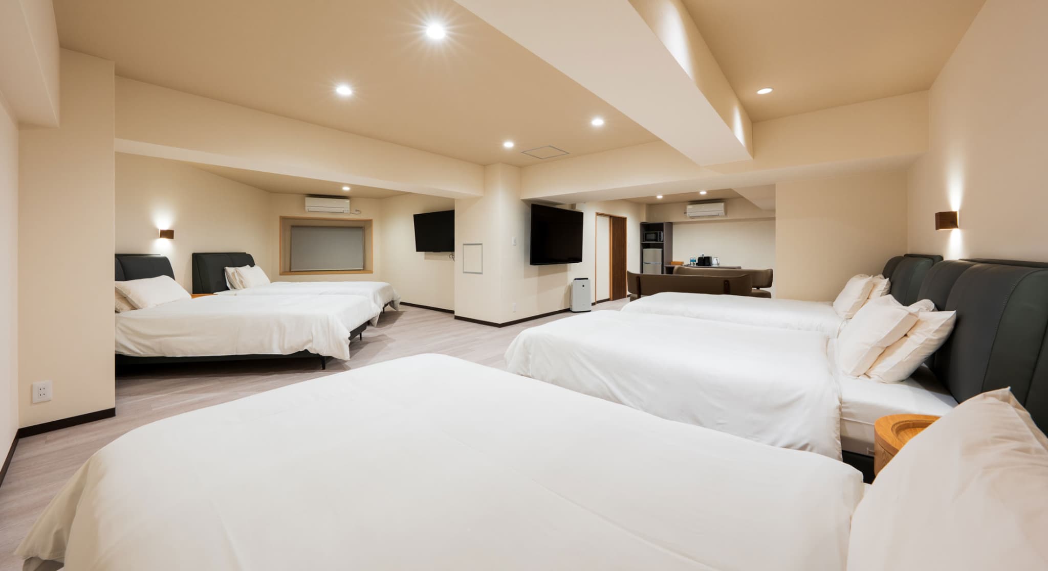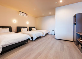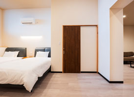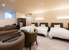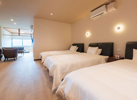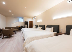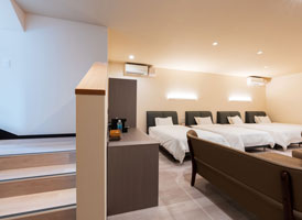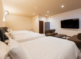 神和苑中腹に佇む【宙(sora)】月の棟に位置する、セミダブルベッド5台を備えた洋室です。源泉かけ流しの内風呂を完備しており、最大5名様までご宿泊可能な72㎡の広々とした空間で、ゆったりと寛ぎの時間をお過ごしいただけます。