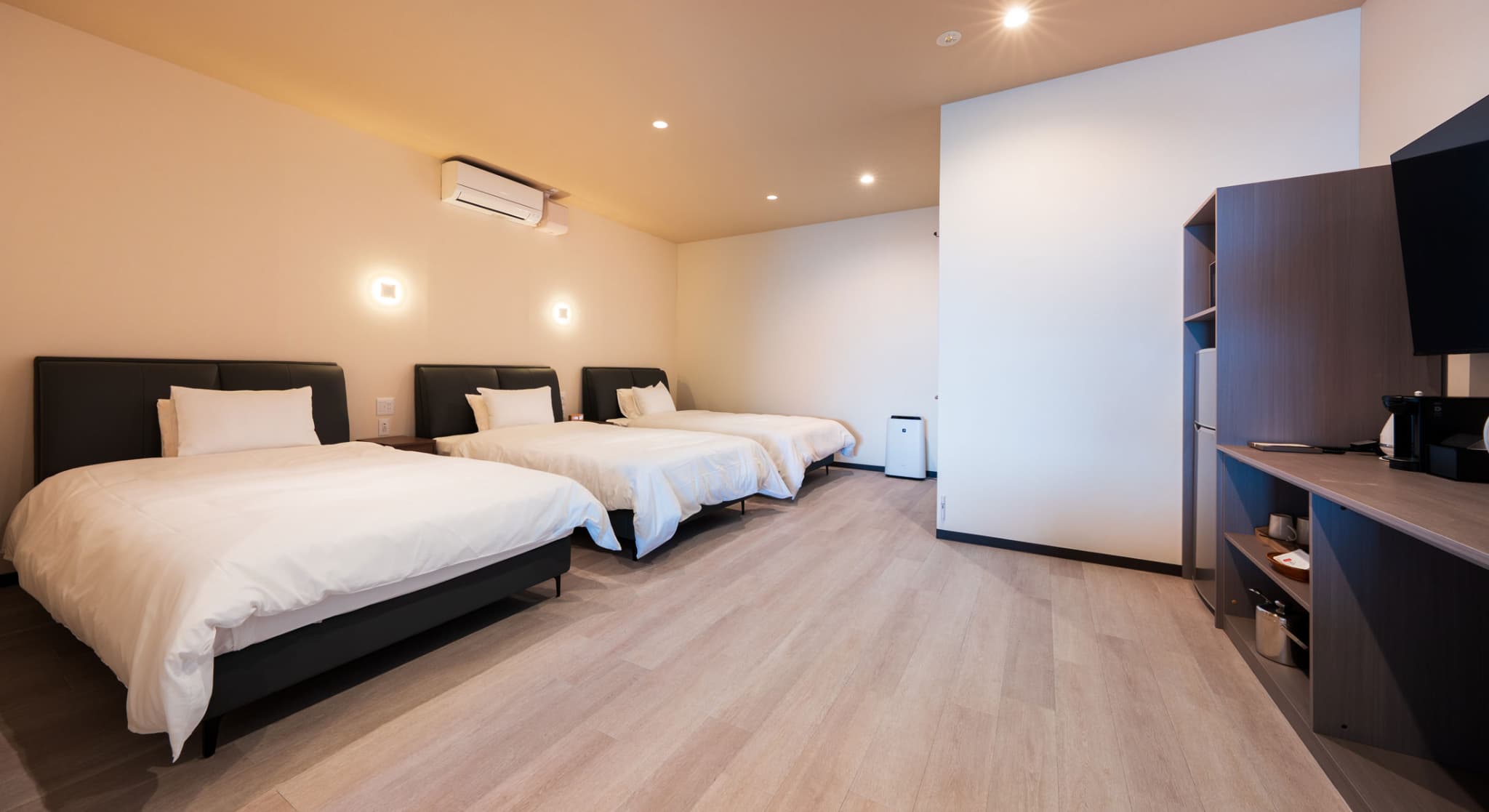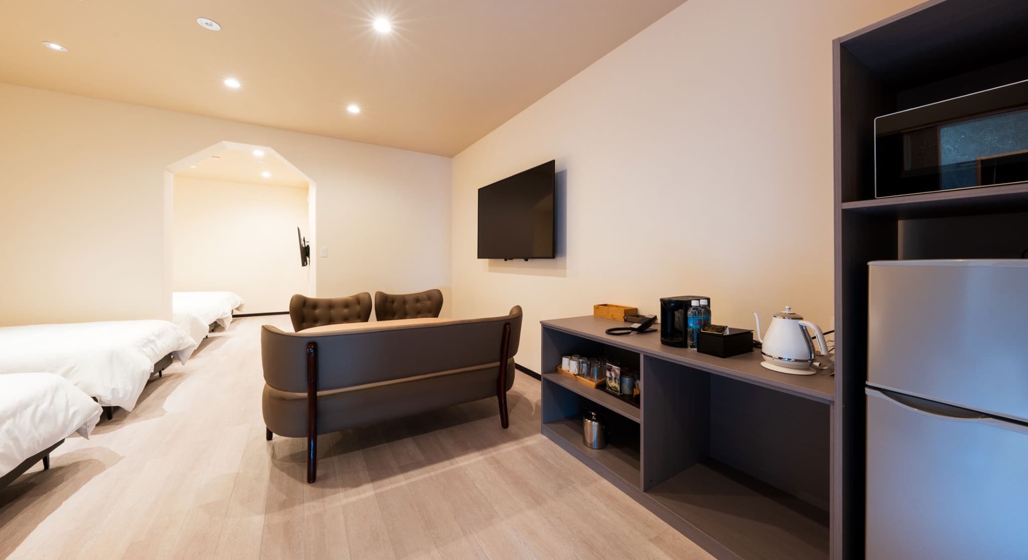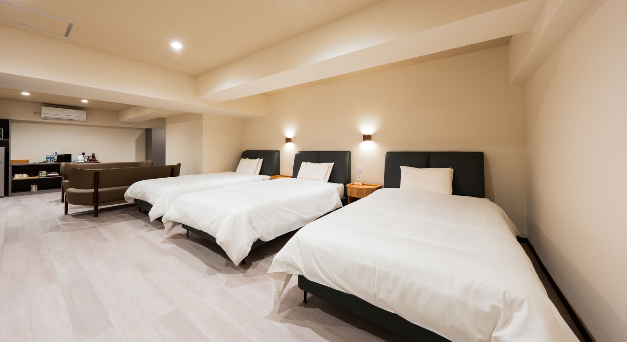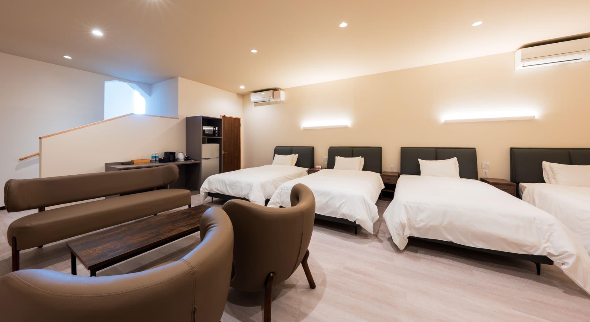 神和苑中腹に佇む【宙(sora)】月の棟に位置する、セミダブルベッド5台を備えた洋室です。源泉かけ流しの内風呂を完備しており、最大5名様までご宿泊可能な72㎡の広々とした空間で、ゆったりと寛ぎの時間をお過ごしいただけます。