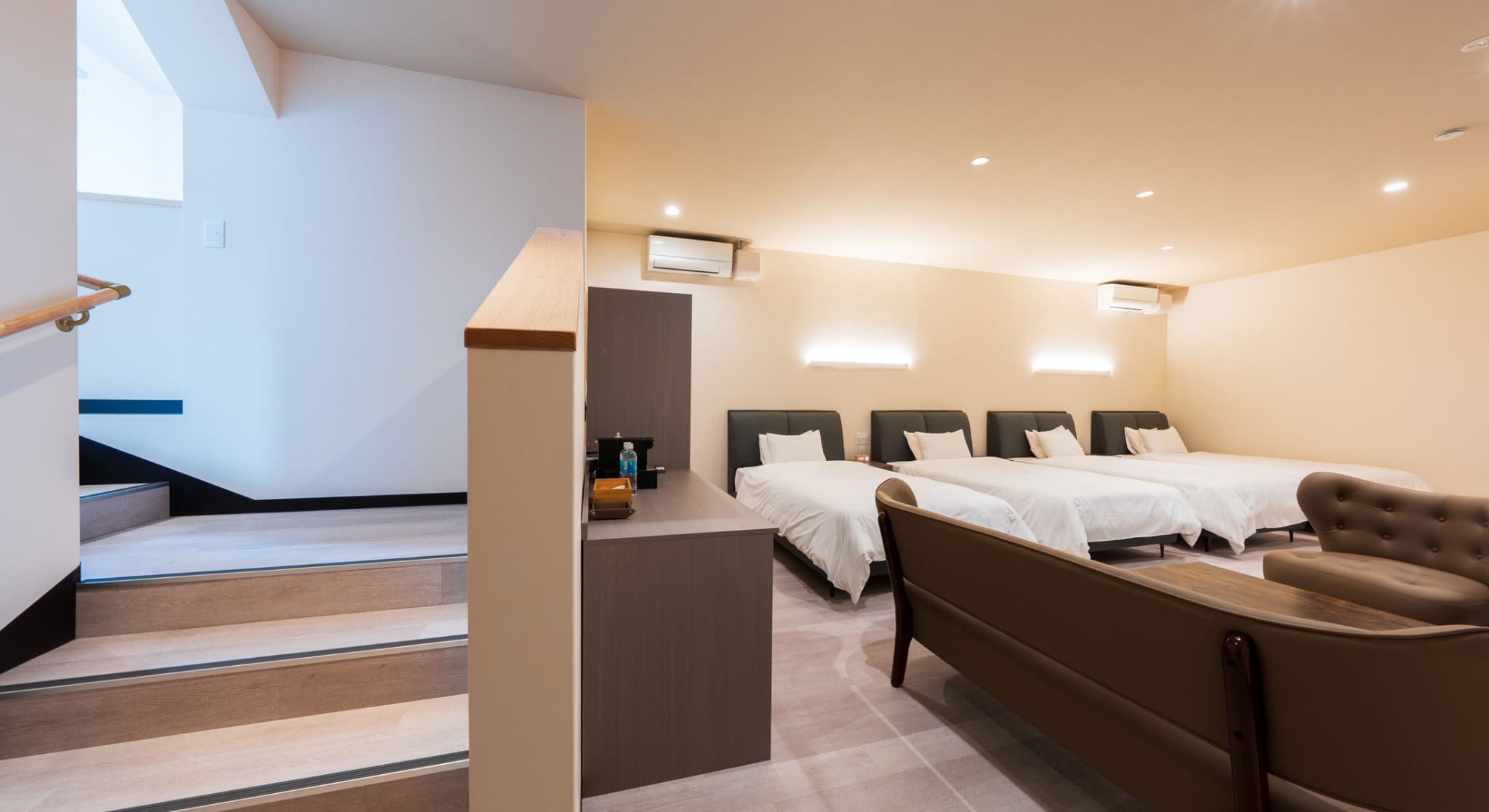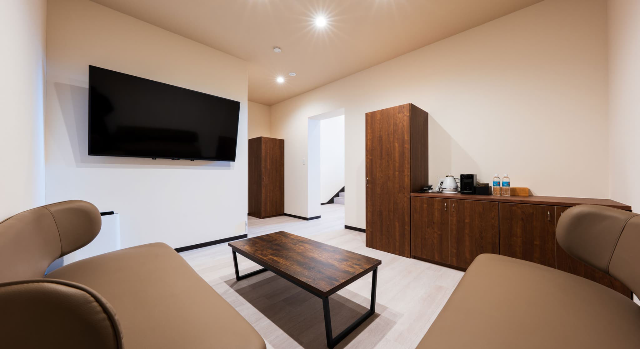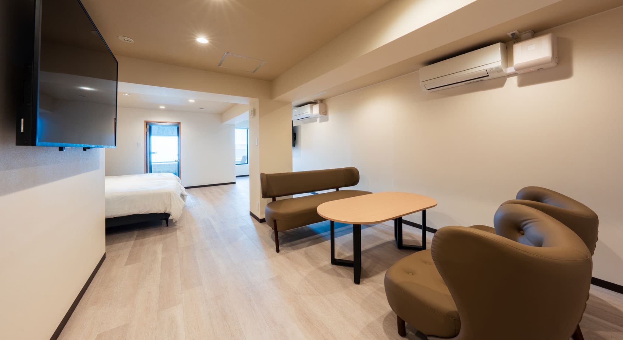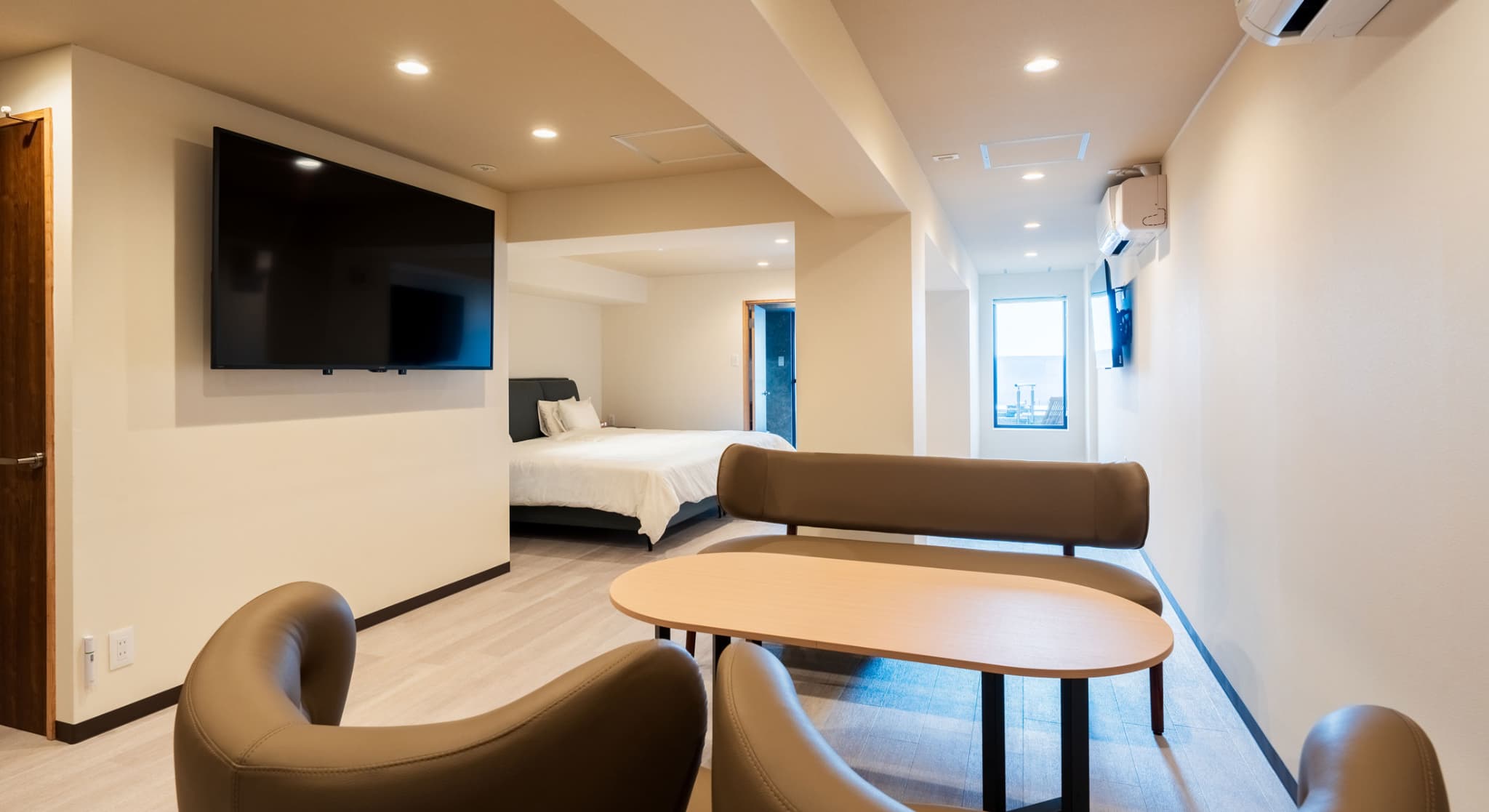 神和苑中腹に佇む【宙(sora)】月の棟に位置する、セミダブルベッド5台を備えた洋室です。源泉かけ流しの内風呂を完備しており、最大5名様までご宿泊可能な72㎡の広々とした空間で、ゆったりと寛ぎの時間をお過ごしいただけます。