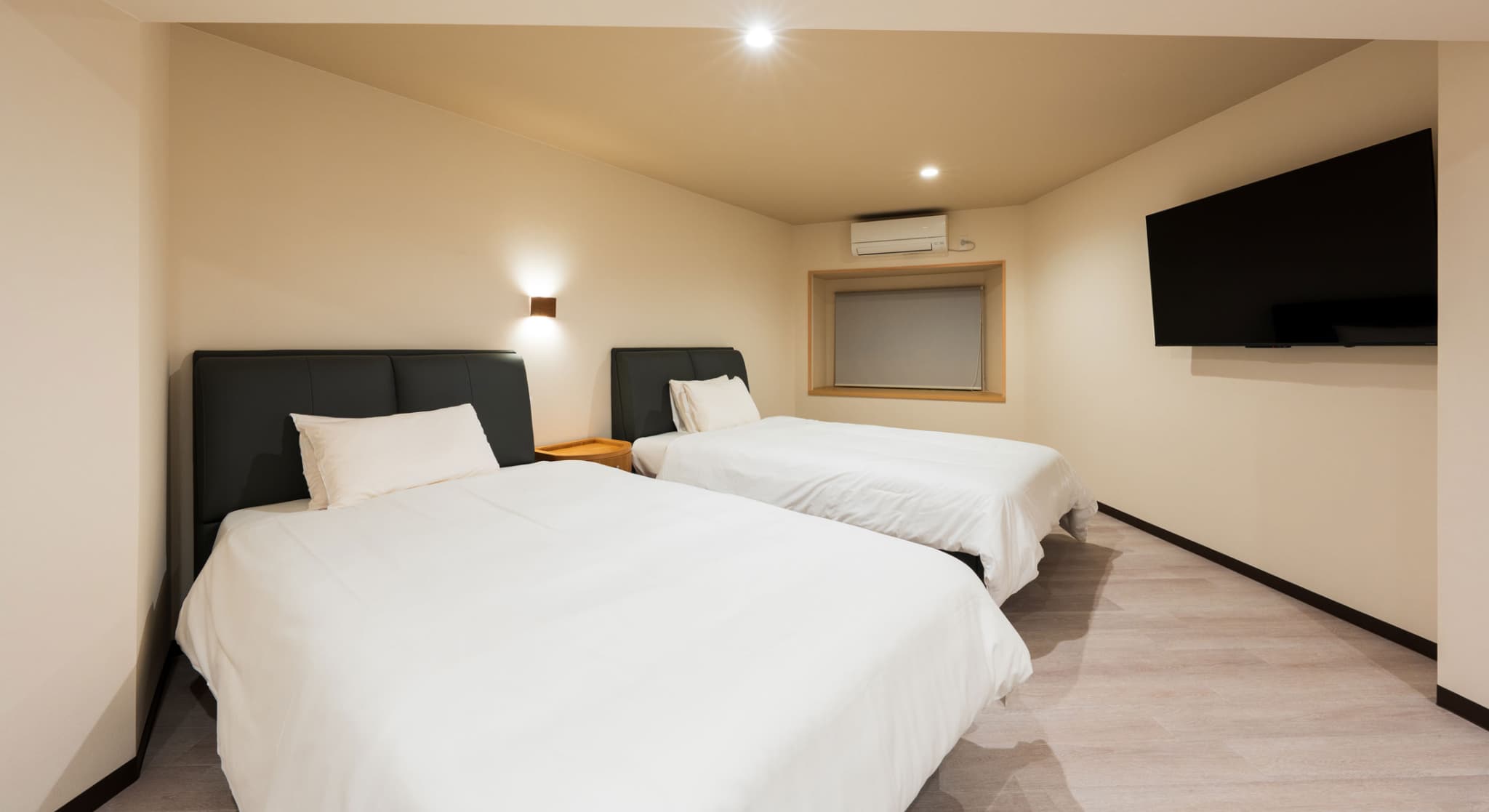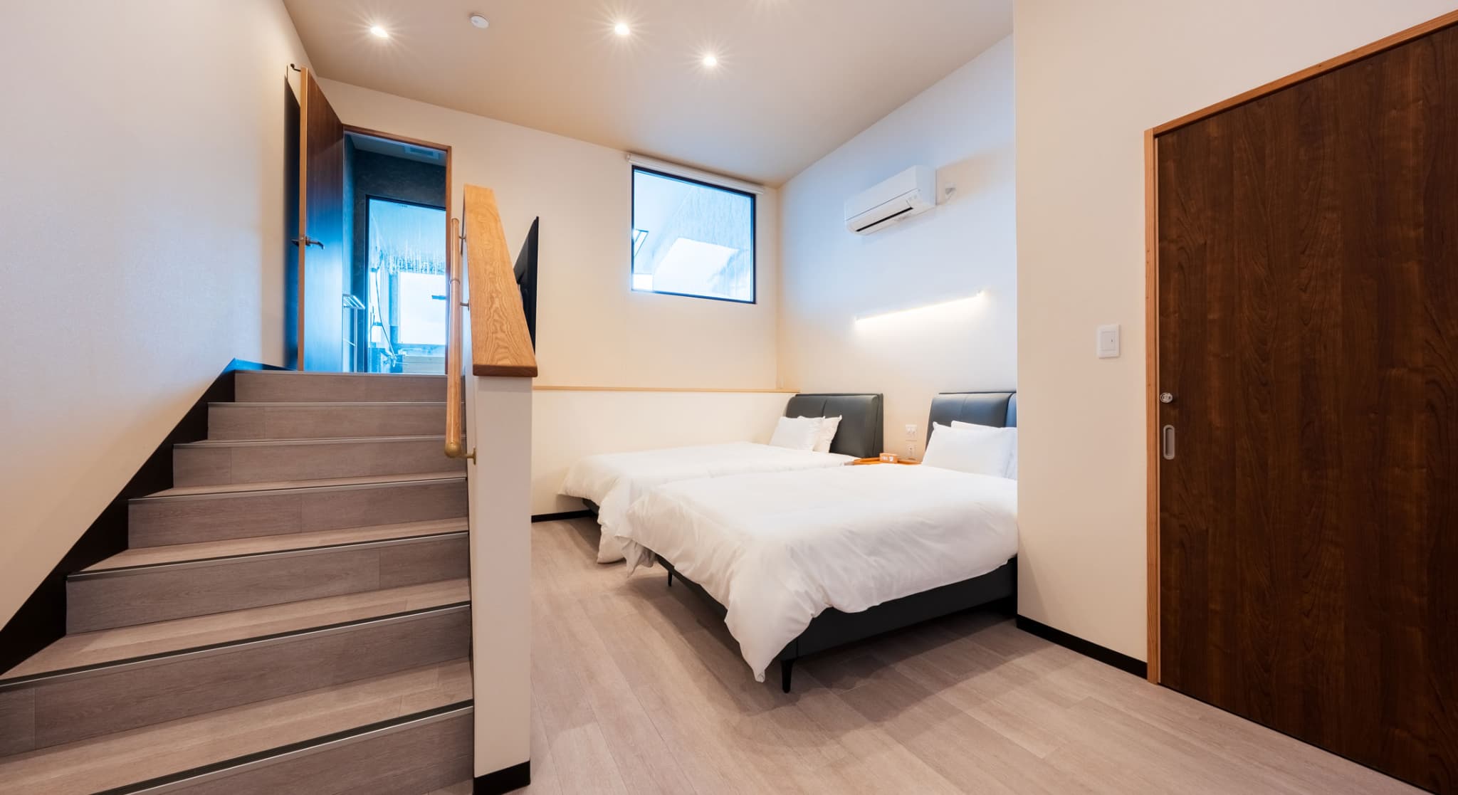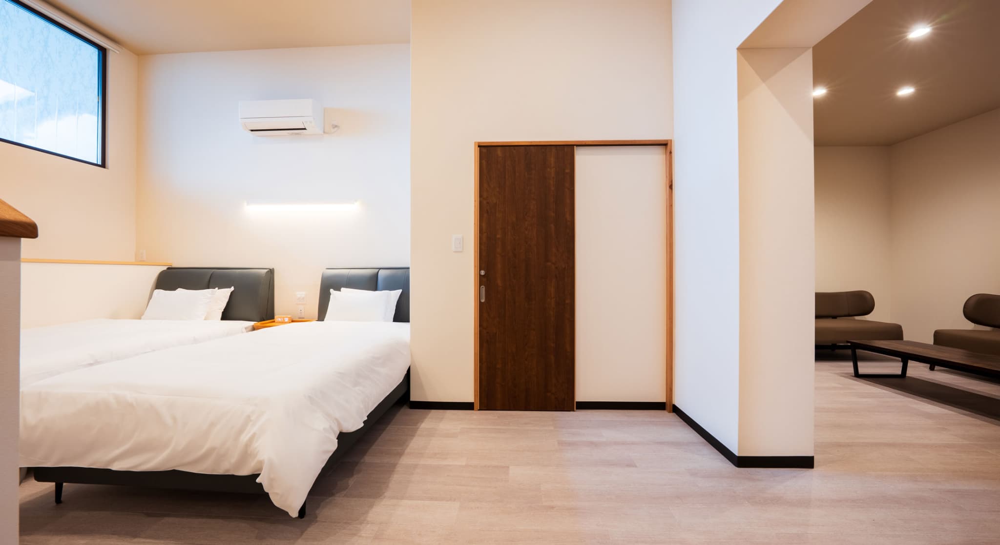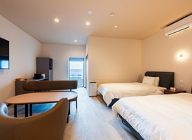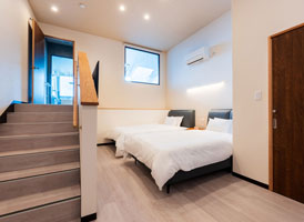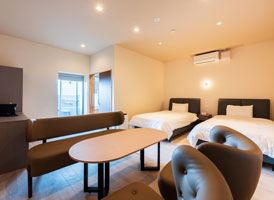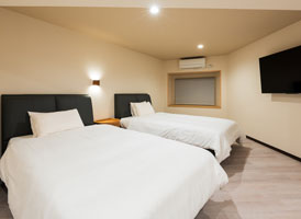 神和苑中腹に佇む【宙(sora)】月の棟に位置するセミダブルベッド2台を備えた洋室です。別府を一望できる源泉100%かけ流しの内風呂・露天風呂からは、夜明けの街をやさしく染め上げる朝日をご覧いただけます。※ステップフロア仕様。