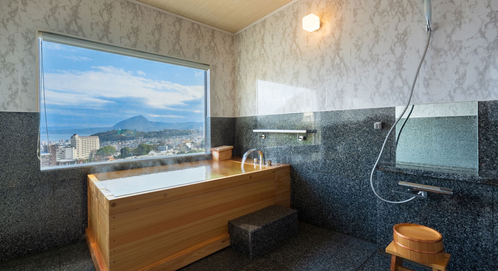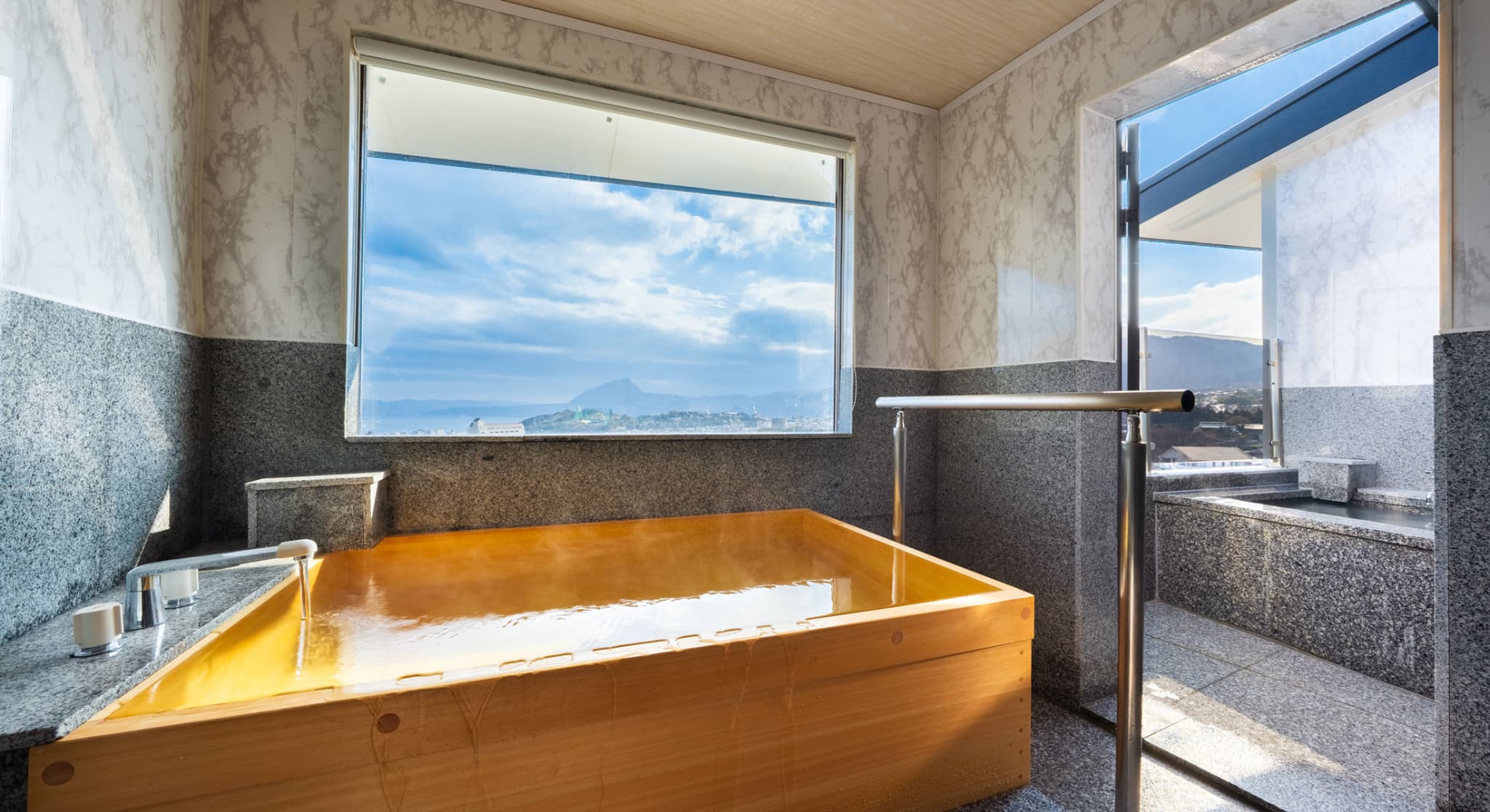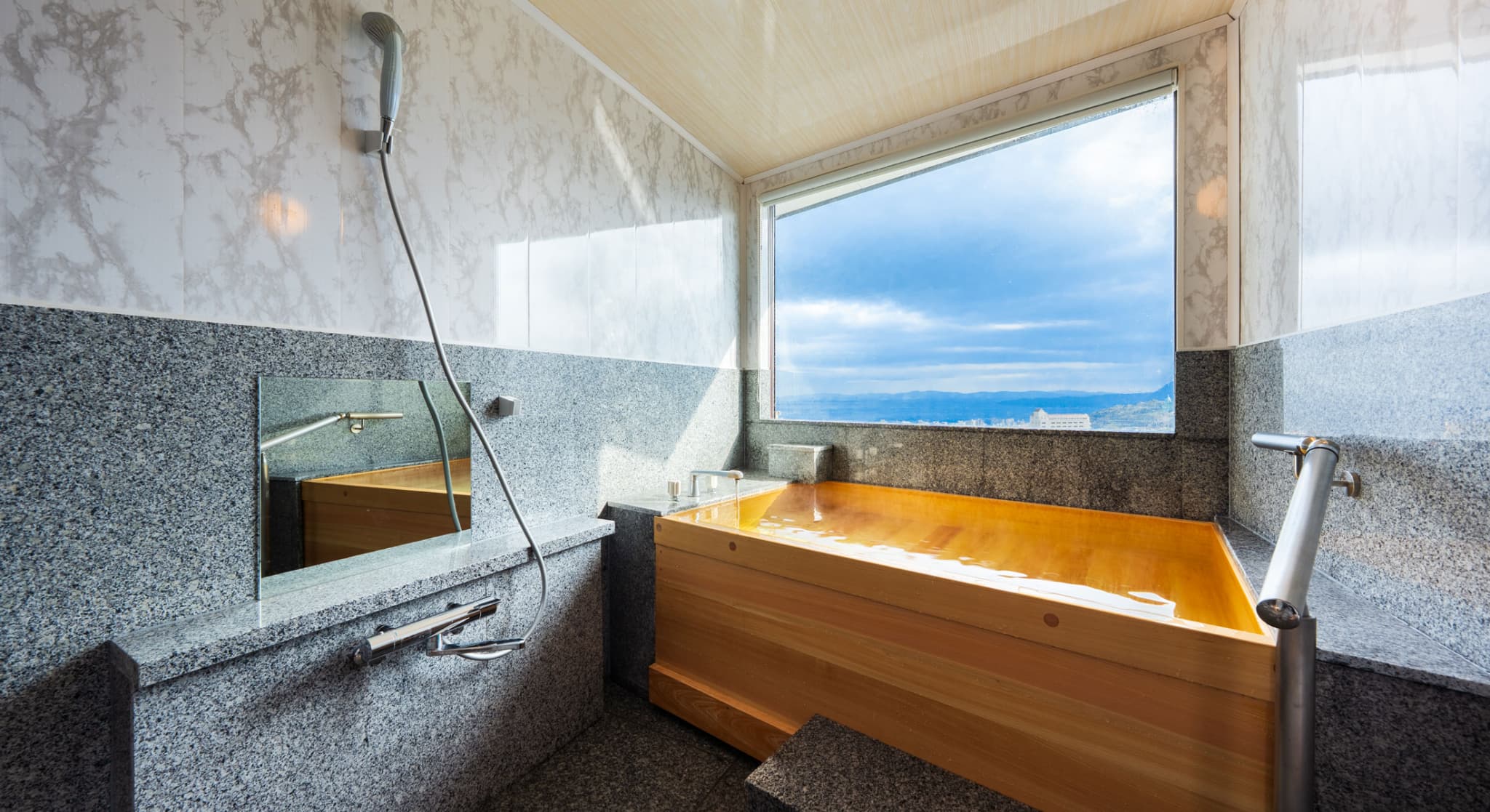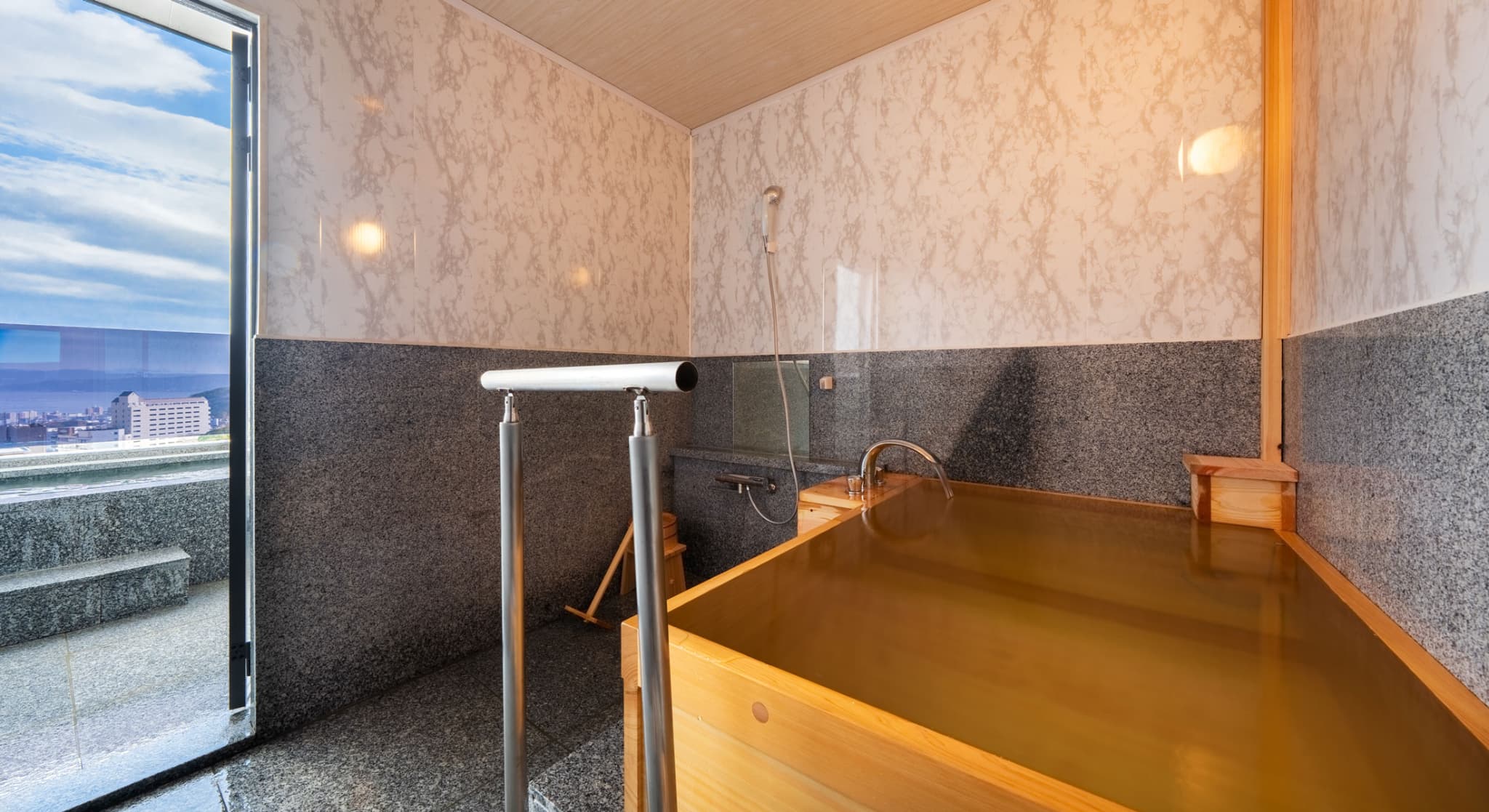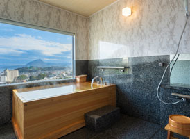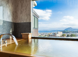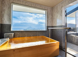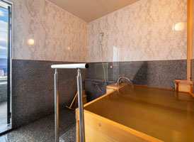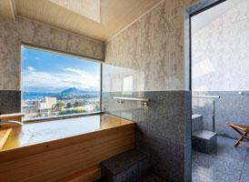 朝日が差し込む ひのき風呂。 能楽堂を見下ろす本館客室。 お部屋から別府湾が望める眺めの良さ。朝日を浴びながらゆったりと神秘の湯に浸かり、温もりの和室で至福のくつろぎを。夜には、ライトアップされた荘厳な能舞台を肴に物思いに耽るもよし。一日を通して変わる景色と、変わらずそこに在る空間があなたを優しく包みます。※車椅子でもご利用いただけるよう、全面御影石貼り、バリアフリータイプの客室です。