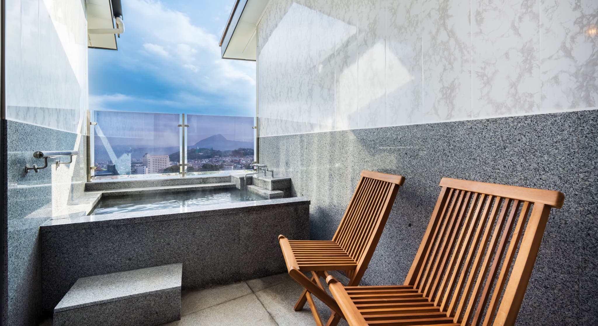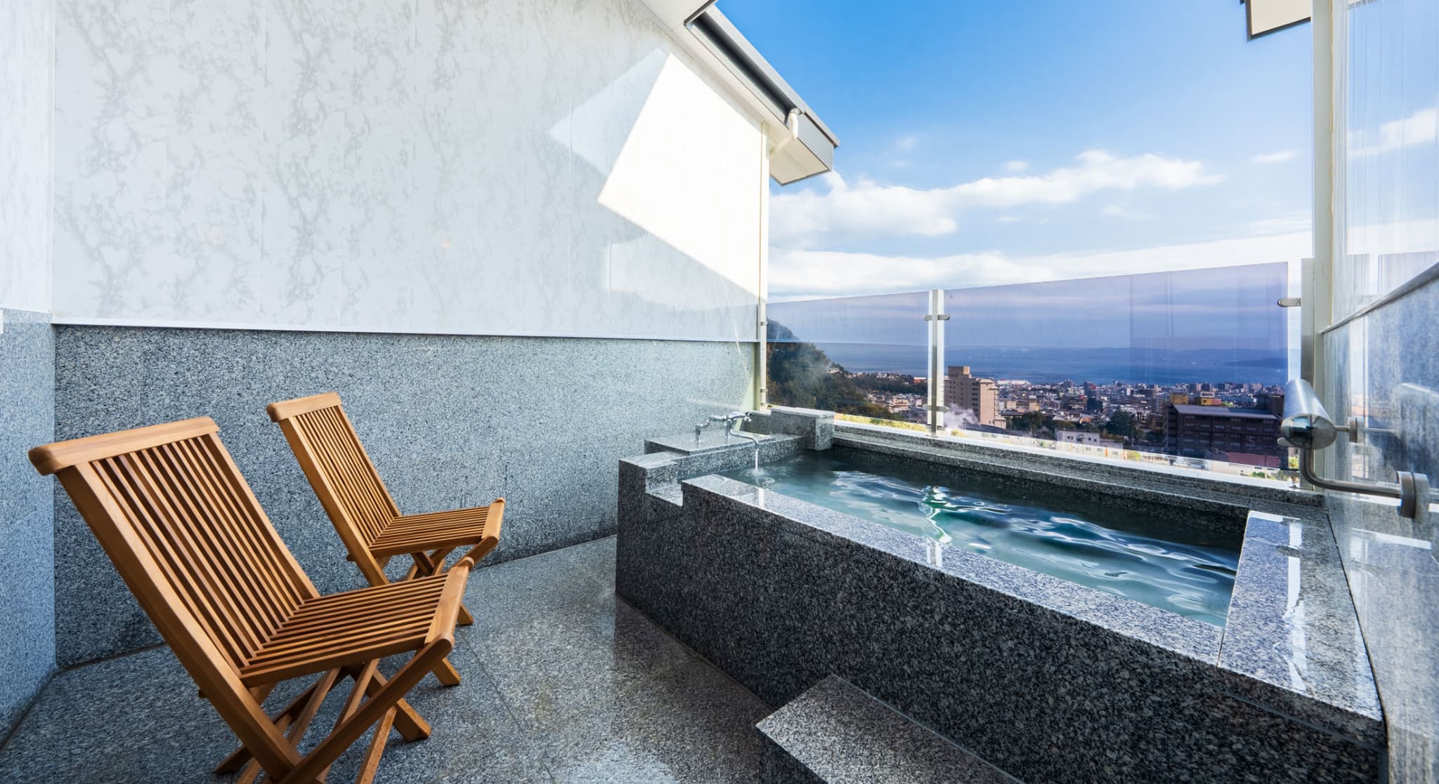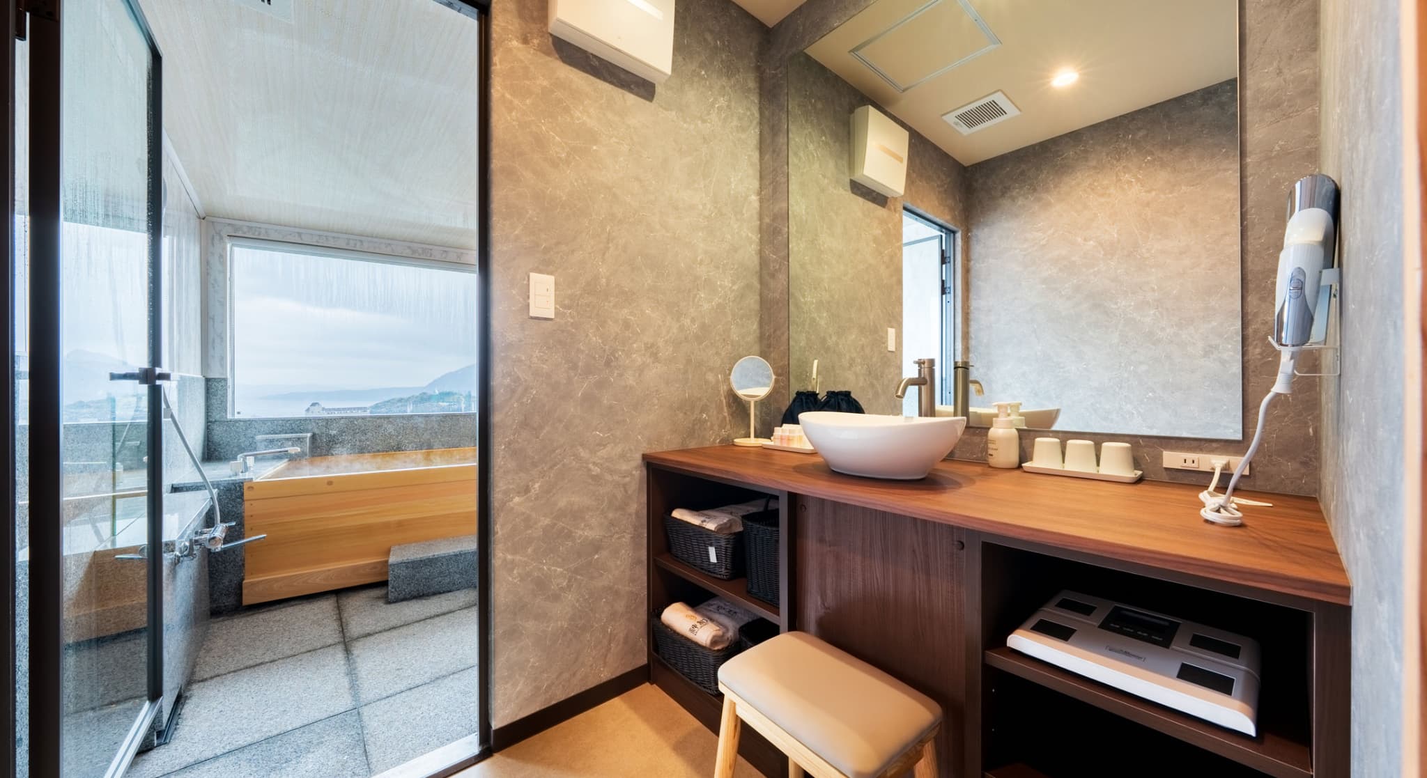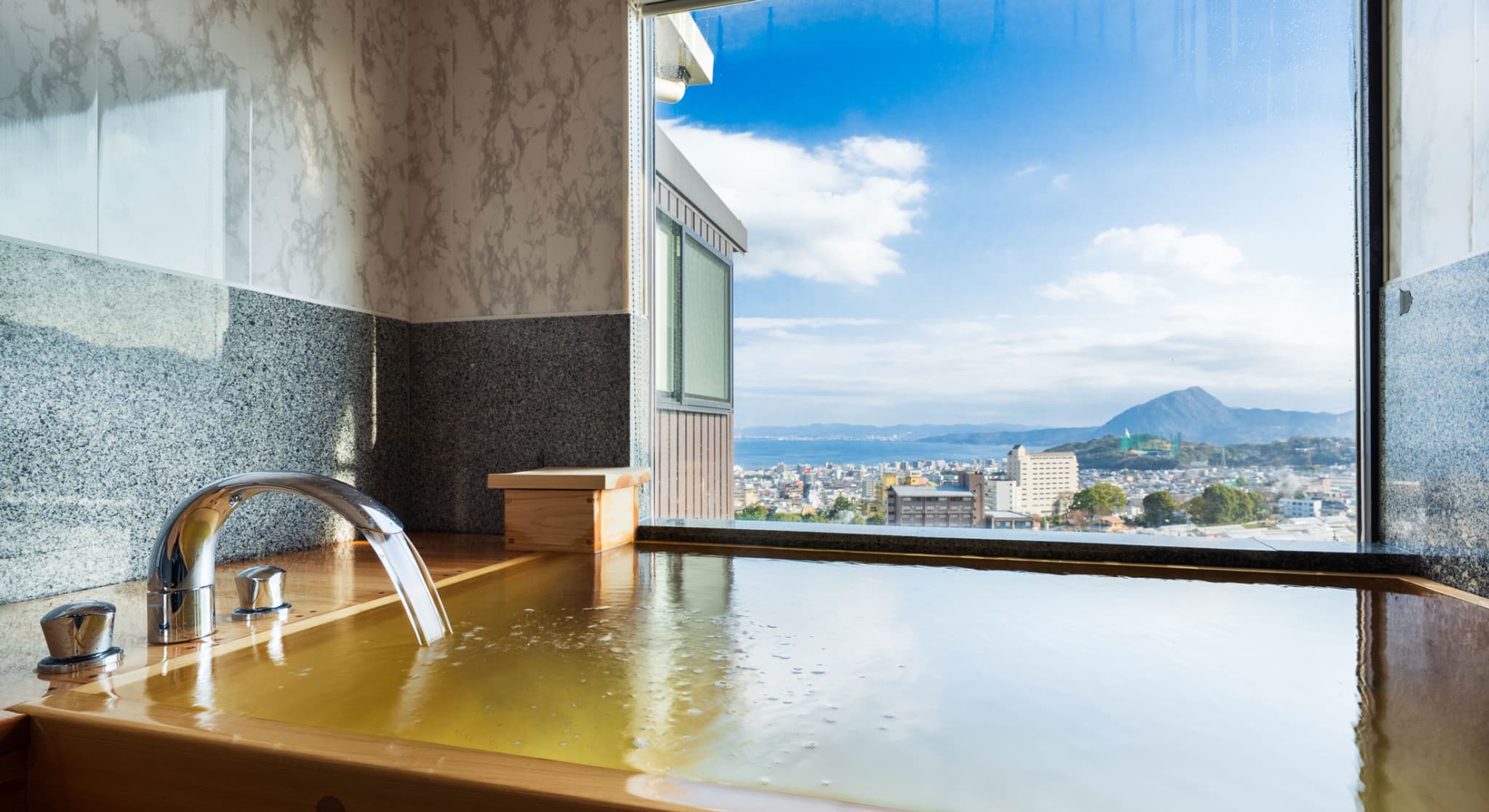 朝日が差し込む ひのき風呂。 能楽堂を見下ろす本館客室。 お部屋から別府湾が望める眺めの良さ。朝日を浴びながらゆったりと神秘の湯に浸かり、温もりの和室で至福のくつろぎを。夜には、ライトアップされた荘厳な能舞台を肴に物思いに耽るもよし。一日を通して変わる景色と、変わらずそこに在る空間があなたを優しく包みます。※車椅子でもご利用いただけるよう、全面御影石貼り、バリアフリータイプの客室です。