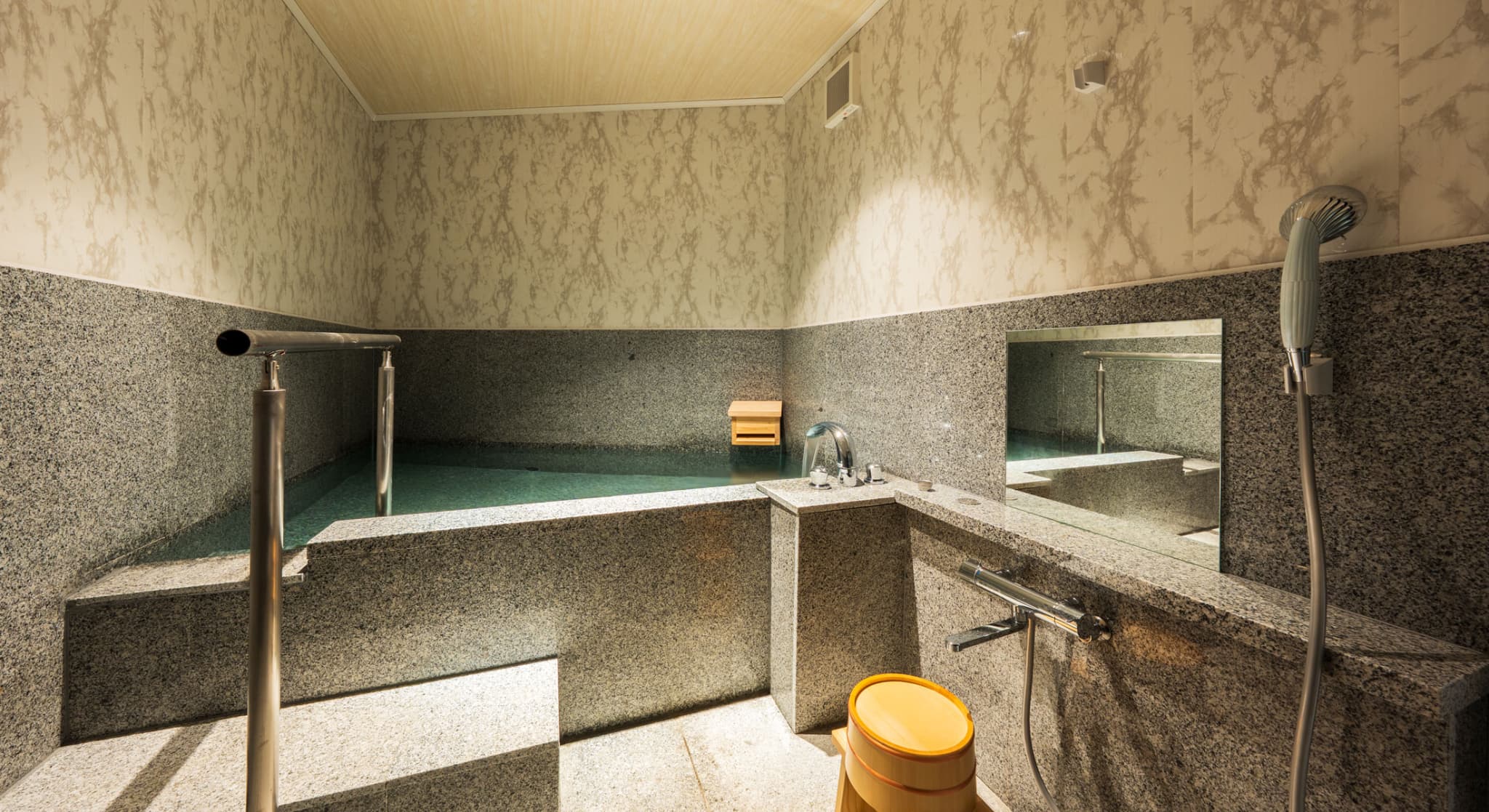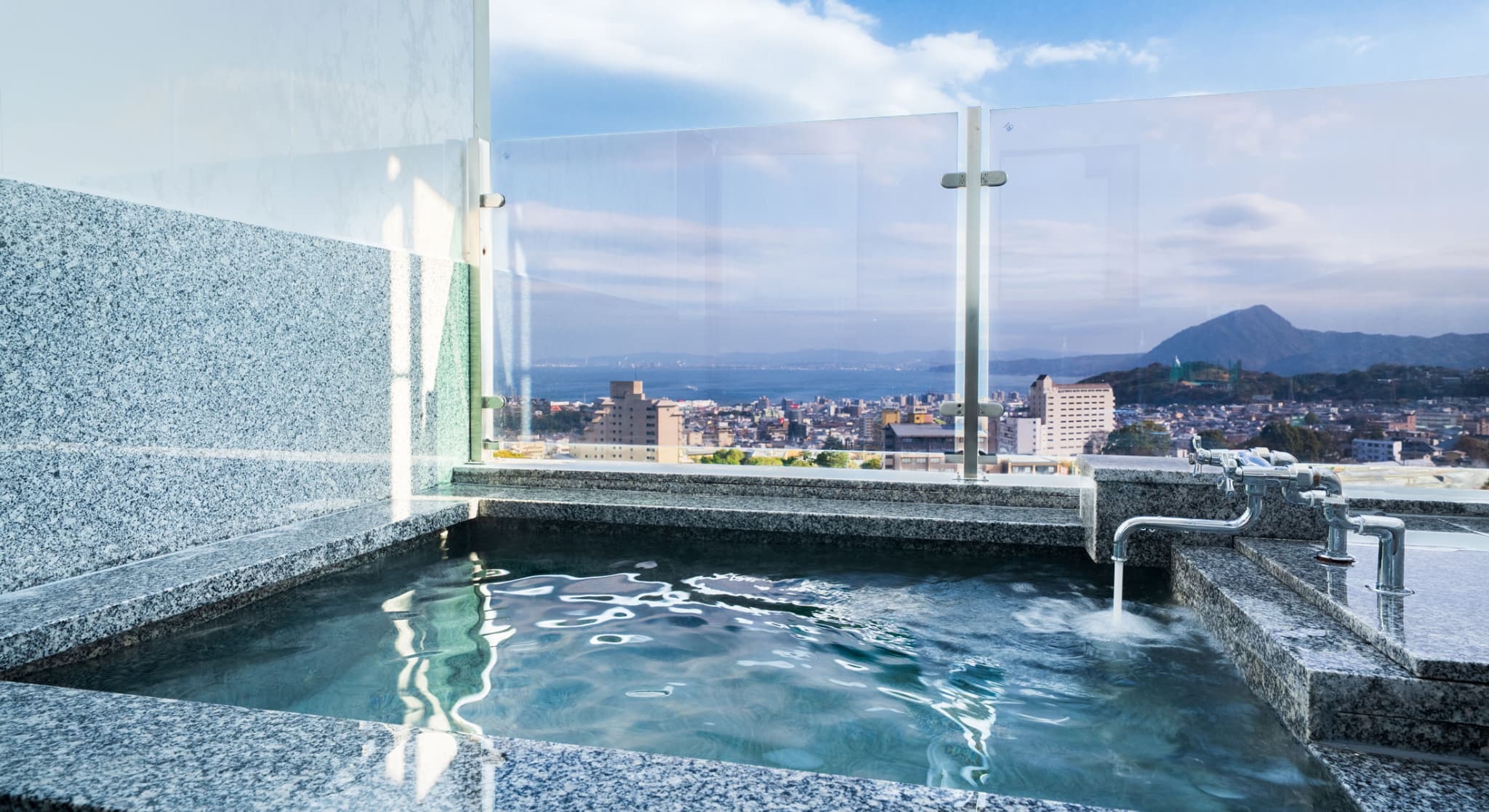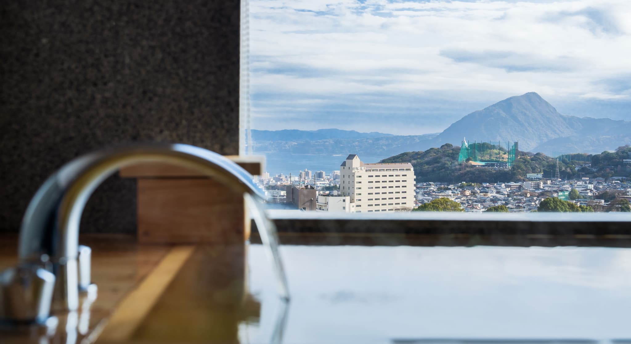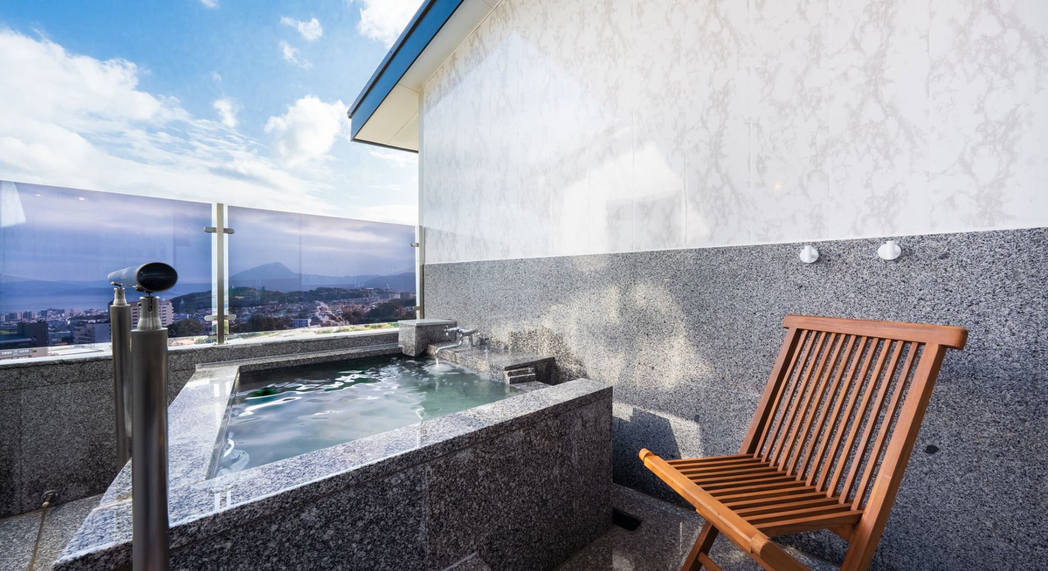 朝日が差し込む ひのき風呂。 能楽堂を見下ろす本館客室。 お部屋から別府湾が望める眺めの良さ。朝日を浴びながらゆったりと神秘の湯に浸かり、温もりの和室で至福のくつろぎを。夜には、ライトアップされた荘厳な能舞台を肴に物思いに耽るもよし。一日を通して変わる景色と、変わらずそこに在る空間があなたを優しく包みます。※車椅子でもご利用いただけるよう、全面御影石貼り、バリアフリータイプの客室です。