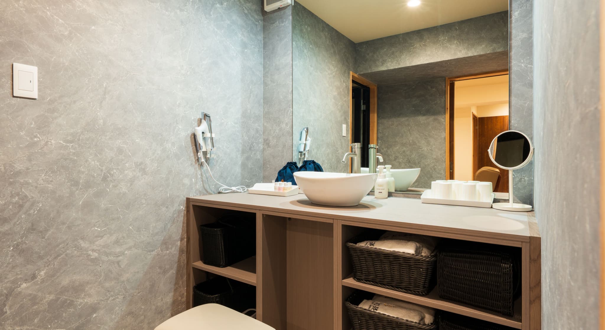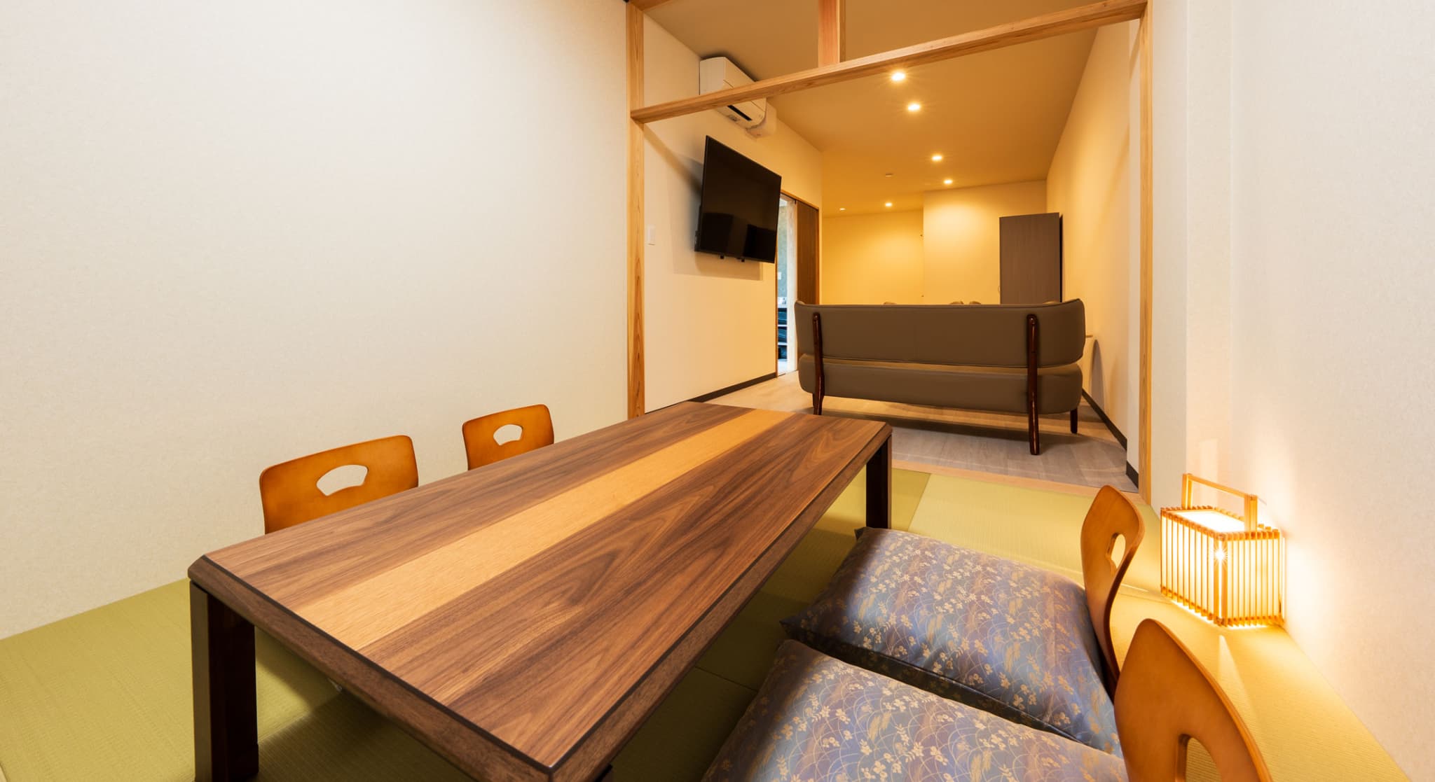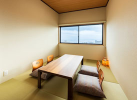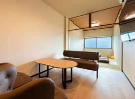 本館2階に位置し、能楽堂を見下ろす客室。窓から差し込む朝日を浴びながらゆったりと神秘の青湯を堪能。温もりのある和室で台湾茶を飲みながら至福のくつろぎを。一日を通して変わる景色と、変わらずそこに在る空間があなたを優しく包みます。