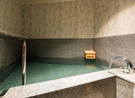 朝日が差し込む檜風呂。檜のほのかな香りと神秘の青湯に、心休まるひと時を。本館2階に位置した見晴らしの良い客室で過ごす。夜にはライトアップされた荘厳な能舞台を肴に物思いに耽るもよし。苑内で最もコンパクトながら、十分な広さを備えたお部屋。