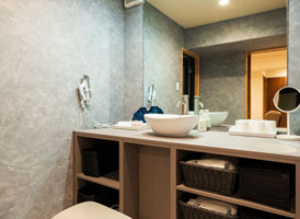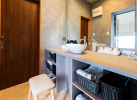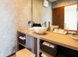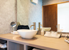 夕暮れ時にはぽつぽつと幻想的な灯りが導く回廊と庭園の傍らに構える露天風呂付き別館客室。部屋によって趣が異なる露天風呂で、心ゆくまで湯浴みを堪能。和室でまったりと、旅の疲れを癒すひと時をお過ごしいただけます。落ち着きのあるベッドルームと、内風呂も備えたゆとりある造りのお部屋です。