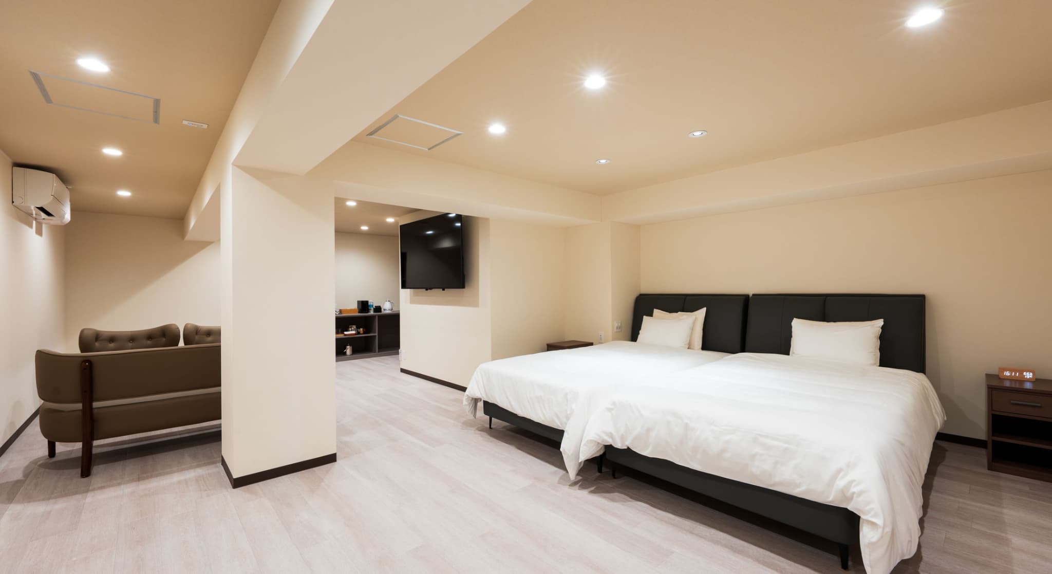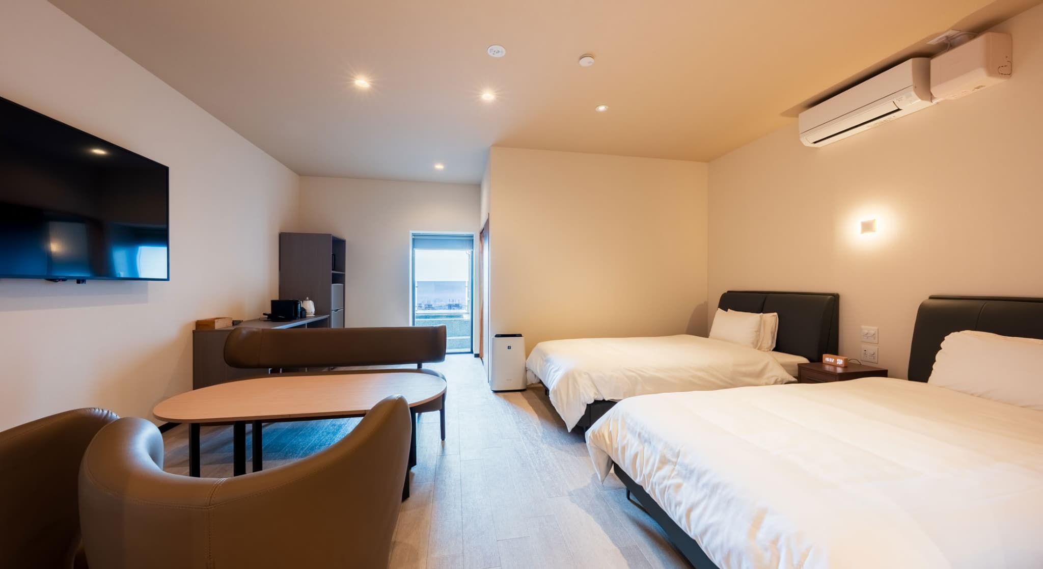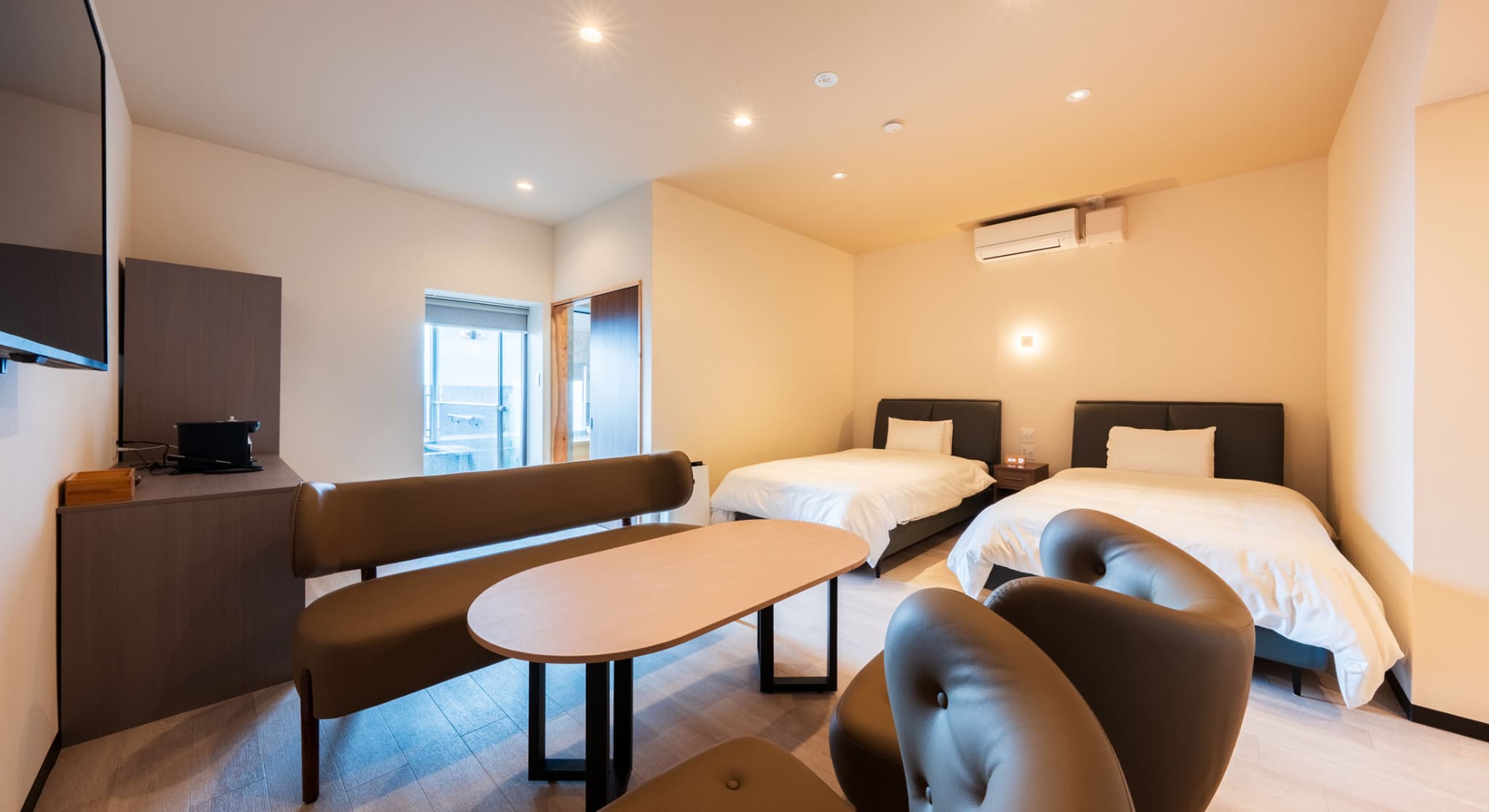 神和苑中腹に佇む【宙(sora)】月の棟月の棟に位置する、セミダブルベッド4台を備えた洋室です。源泉100%かけ流しの内風呂・露天風呂を設えており、露天から望む別府の街並みとともに、贅沢な湯のひとときをご堪能ください。