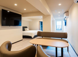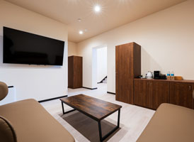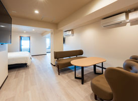 148㎡と苑内でも最大の広さを誇り、ダブルベッドも苑内唯一の6台を備える。最大8名まで宿泊が可能な客室は、開放感のあるゆったりとしたリビングと、広々とした和室を併せ持ち、団欒にも最適。客室内に専用の内風呂が2ヶ所あり、更に苑内の高台に位置する【宙】の中で最も大浴場に近いため、大人数でもお好きな時に源泉かけ流しの温泉をお楽しみいただけます。※玄関前に10段程度の階段がございます。