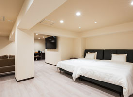 本館2階にある客室。当苑で唯一キッチンとキッズルームを併設しております。食材を持ち込んで調理も可能。キッズルームは十分な広さがあり、お子様用のおもちゃをご用意しております。小さなお子様連れでも安心のお部屋で、家族団らんのひとときをお過ごしください。141平米の客室にダブルベッド2台を備え、最大5名迄宿泊が可能。専用の檜内湯を備えています。