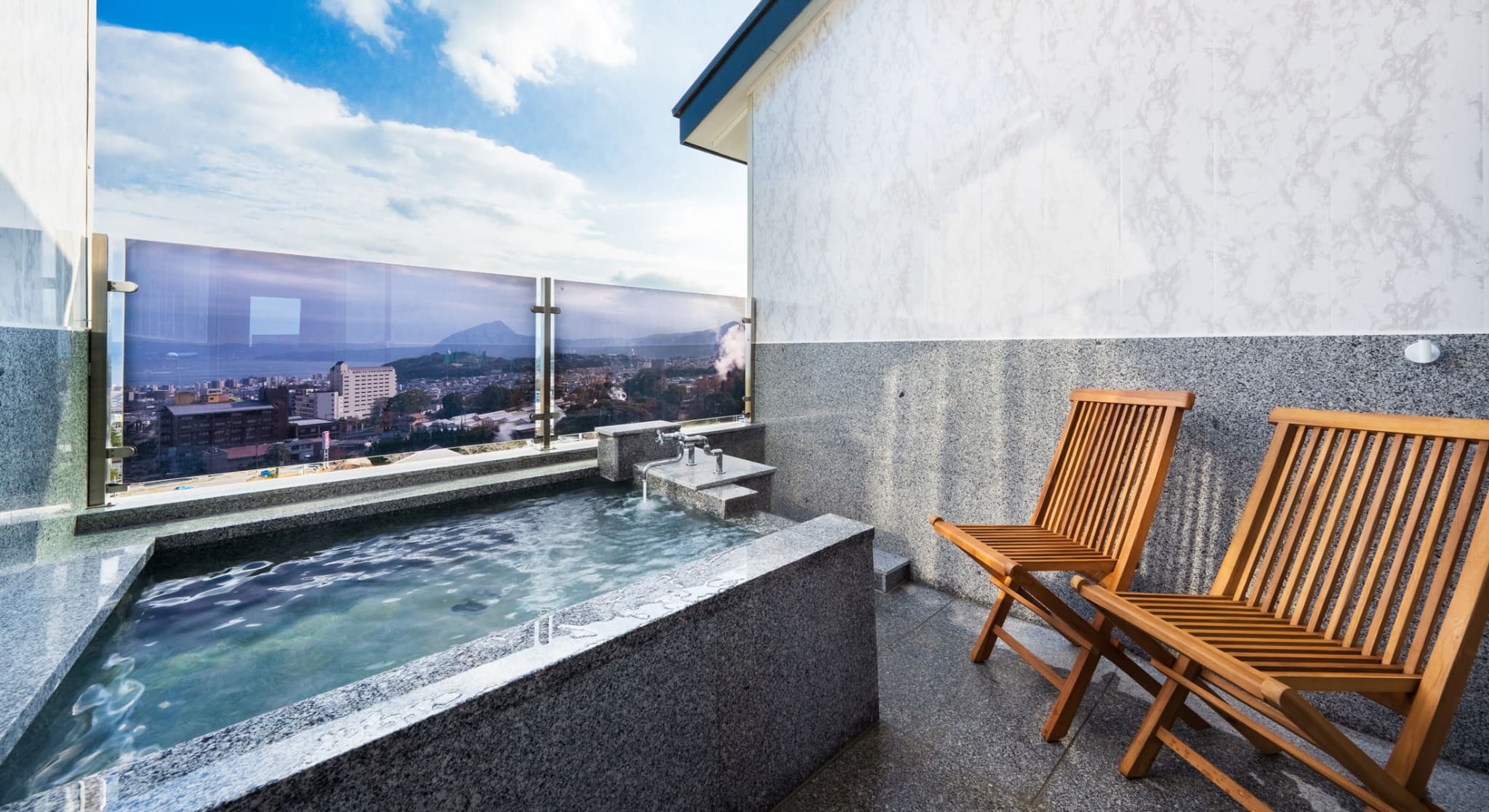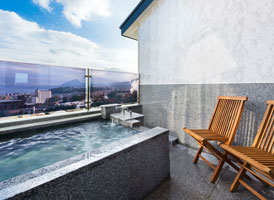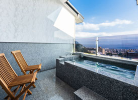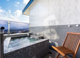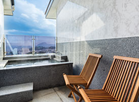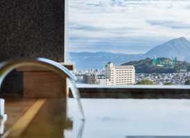 宙館唯一の特別室は、まるで空に浮かぶ豪華客船の一室。ソファを配した洋間にくつろぎの和室。143㎡の贅沢な空間と、別府の街を見下ろす景色をご堪能ください。源泉100%かけ流しの露天風呂と内風呂の他、大浴場へも近く「湯治の場」として栄えた鉄輪の湯を存分にお楽しみいただけます。