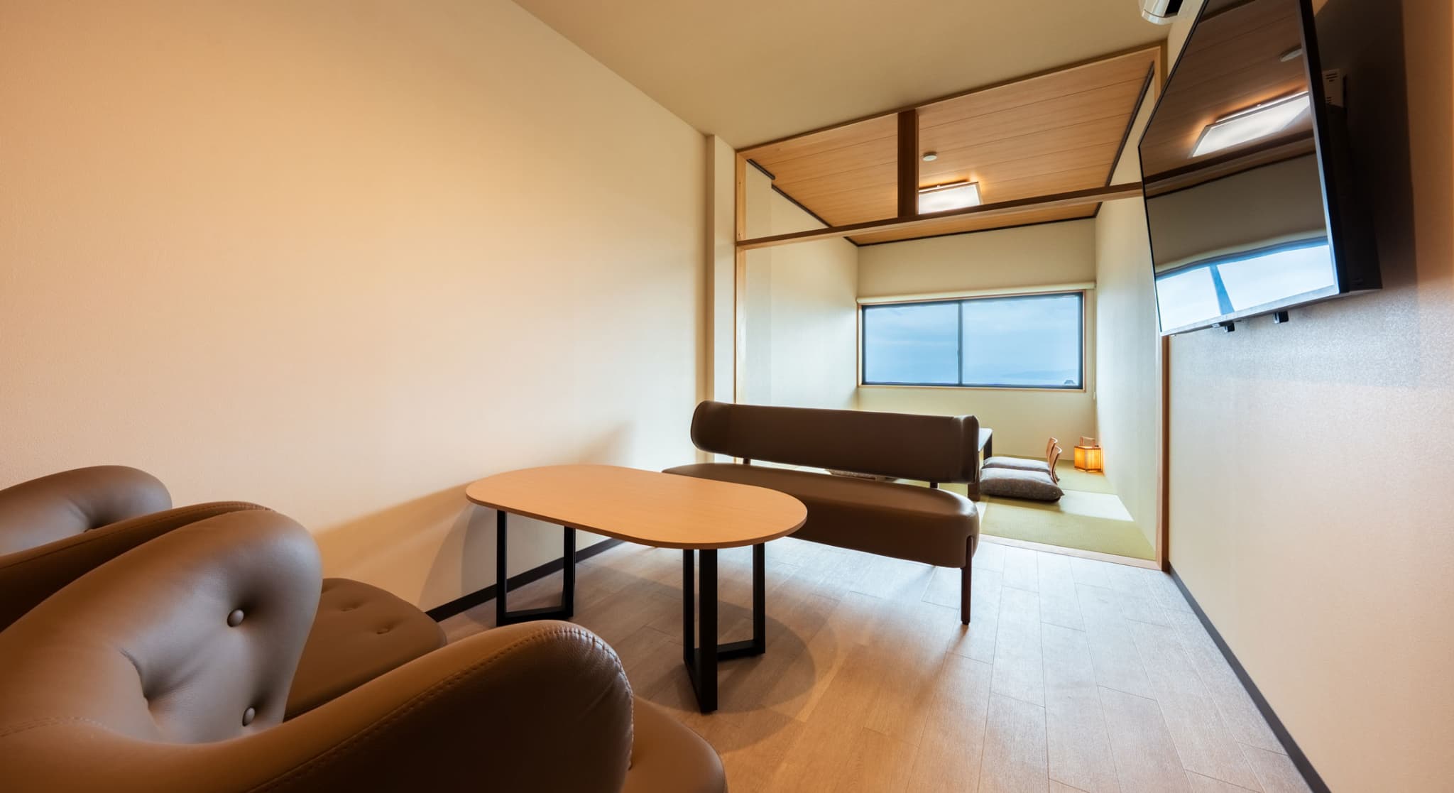 神和苑中腹に佇む【宙(sora)】月の棟に位置する、和室を備えた和洋室タイプです。セミダブルベッド3台と4名以上の場合は布団2組のご準備も可能。源泉100%かけ流しの内風呂・露天風呂から別府の街を一望し、ゆっくりとお寛ぎください。