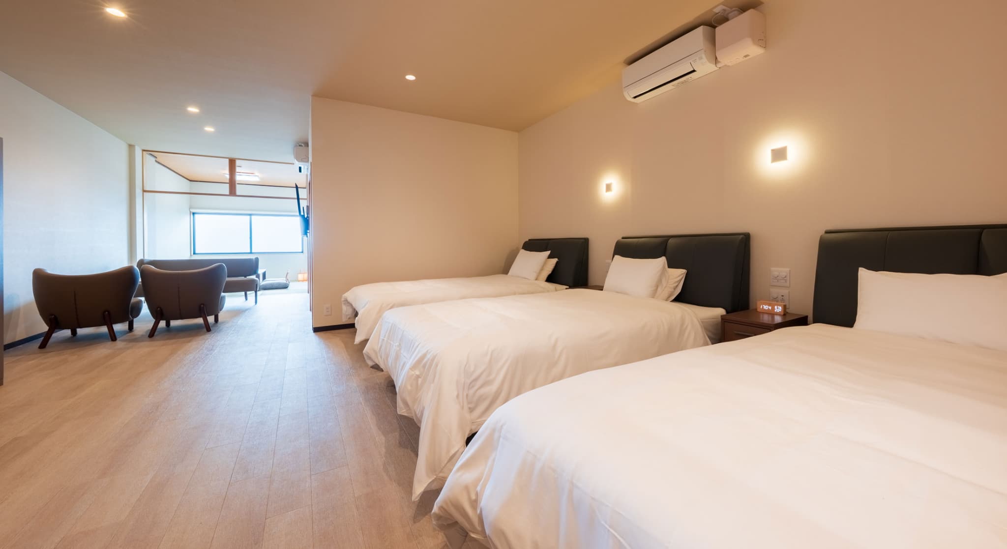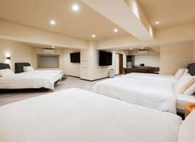 神和苑中腹に佇む【宙(sora)】月の棟に位置する、セミダブルベッド5台を備えた洋室です。源泉かけ流しの内風呂を完備しており、最大5名様までご宿泊可能な72㎡の広々とした空間で、ゆったりと寛ぎの時間をお過ごしいただけます。