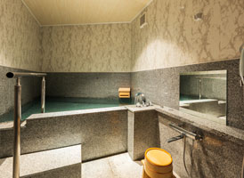 朝日が差し込む檜風呂。檜のほのかな香りと神秘の青湯に、心休まるひと時を。本館2階に位置した見晴らしの良い客室で過ごす。夜にはライトアップされた荘厳な能舞台を肴に物思いに耽るもよし。苑内で最もコンパクトながら、十分な広さを備えたお部屋。