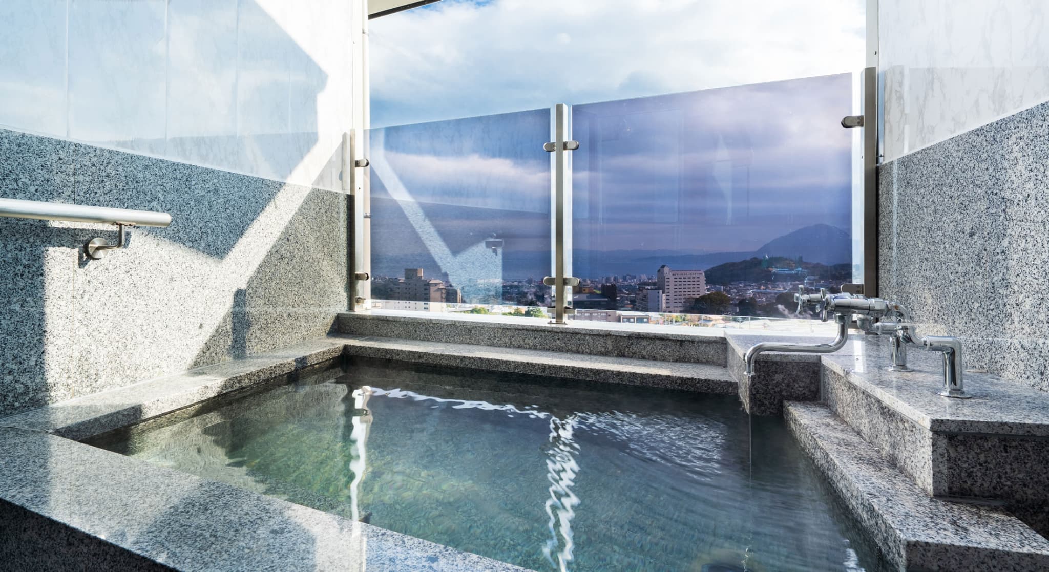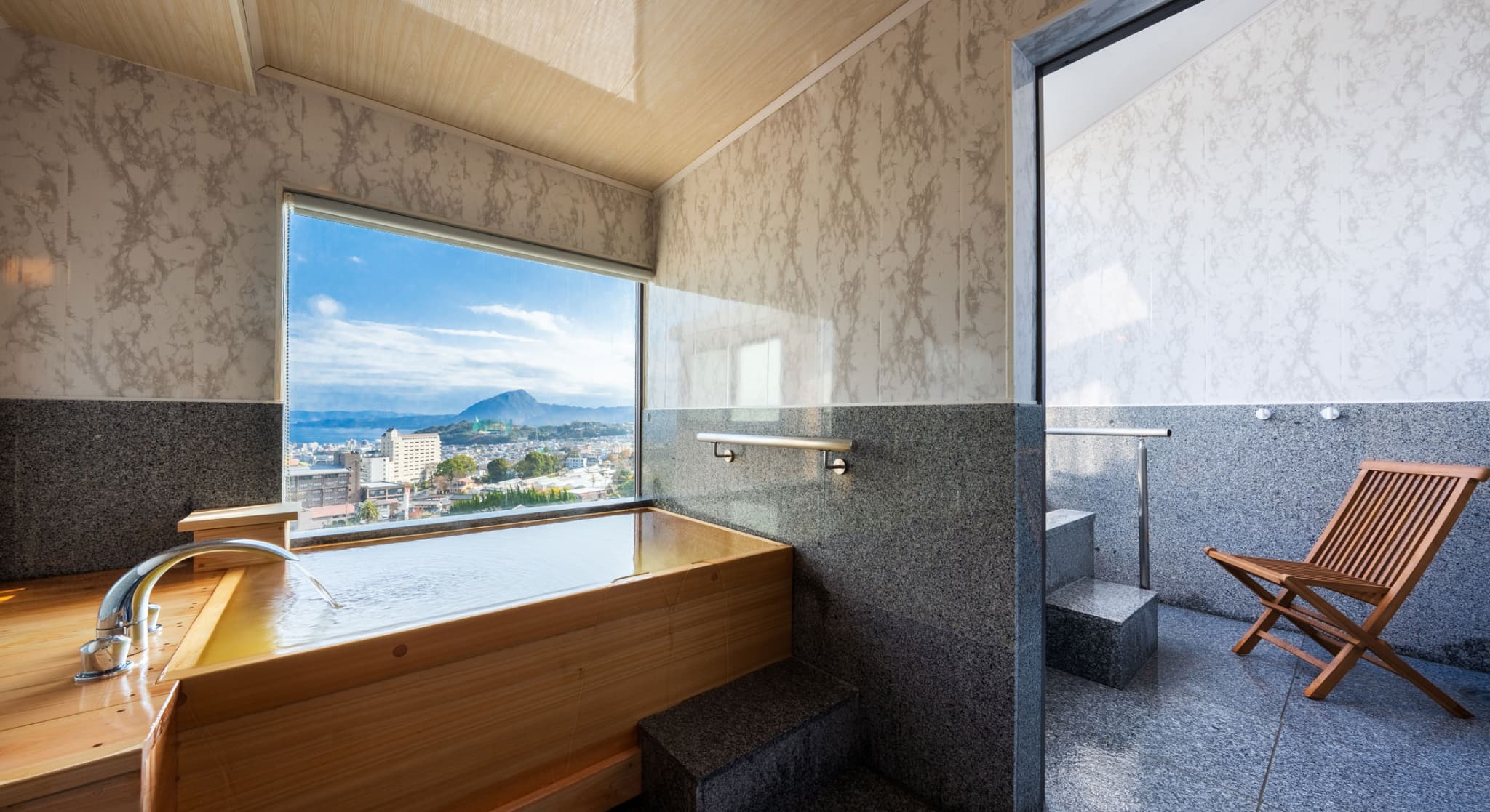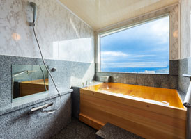 朝日が差し込む ひのき風呂。 能楽堂を見下ろす本館客室。 お部屋から別府湾が望める眺めの良さ。朝日を浴びながらゆったりと神秘の湯に浸かり、温もりの和室で至福のくつろぎを。夜には、ライトアップされた荘厳な能舞台を肴に物思いに耽るもよし。一日を通して変わる景色と、変わらずそこに在る空間があなたを優しく包みます。※車椅子でもご利用いただけるよう、全面御影石貼り、バリアフリータイプの客室です。