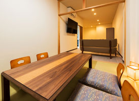 本館2階にある客室。当苑で唯一キッチンとキッズルームを併設しております。食材を持ち込んで調理も可能。キッズルームは十分な広さがあり、お子様用のおもちゃをご用意しております。小さなお子様連れでも安心のお部屋で、家族団らんのひとときをお過ごしください。141平米の客室にダブルベッド2台を備え、最大5名迄宿泊が可能。専用の檜内湯を備えています。